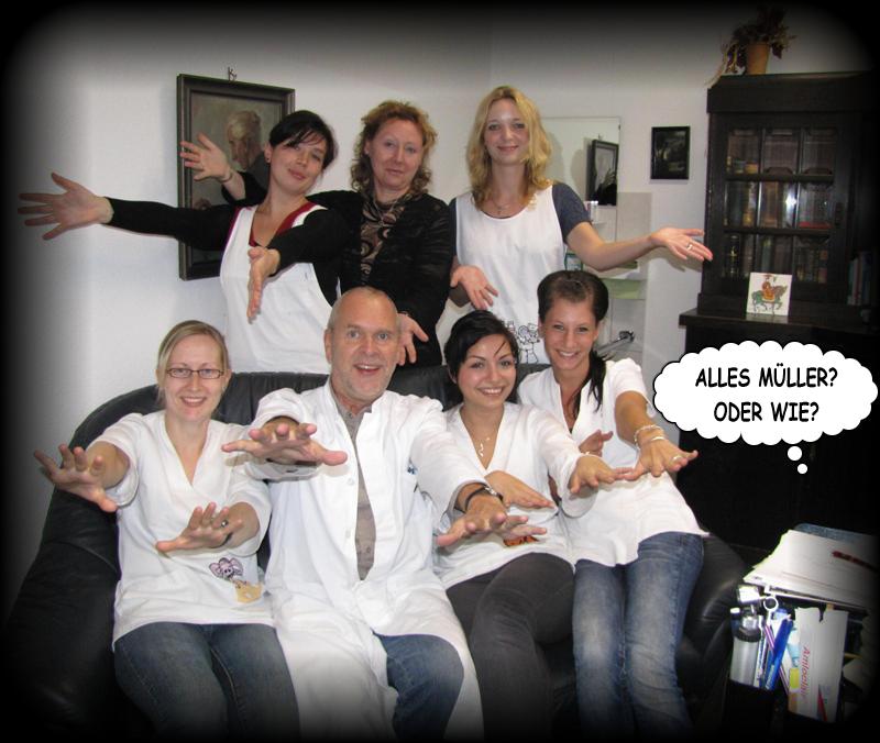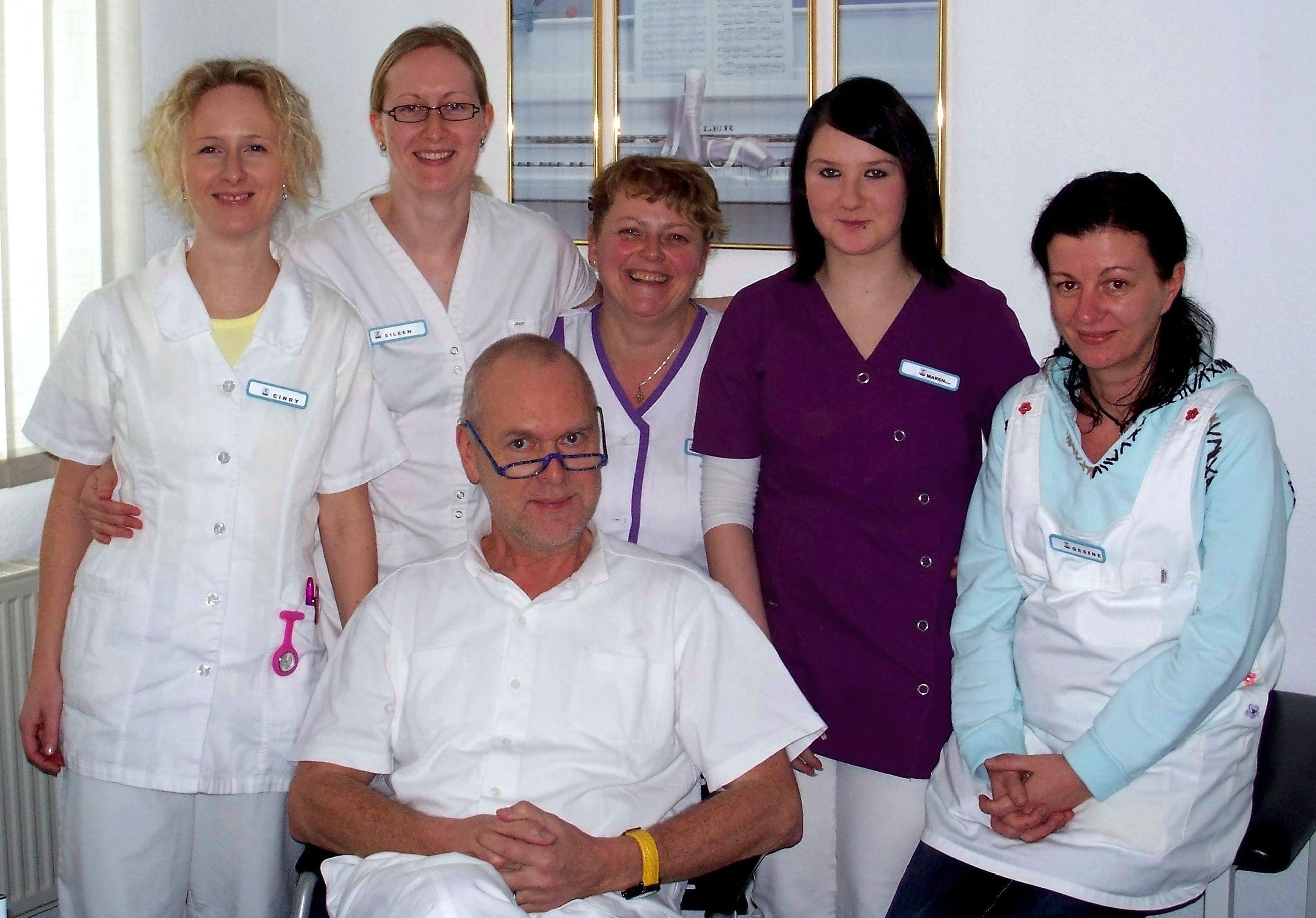 Cindy, Eileen, Birgit, Azubi Maren, Gesine und der Doc